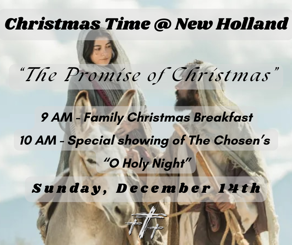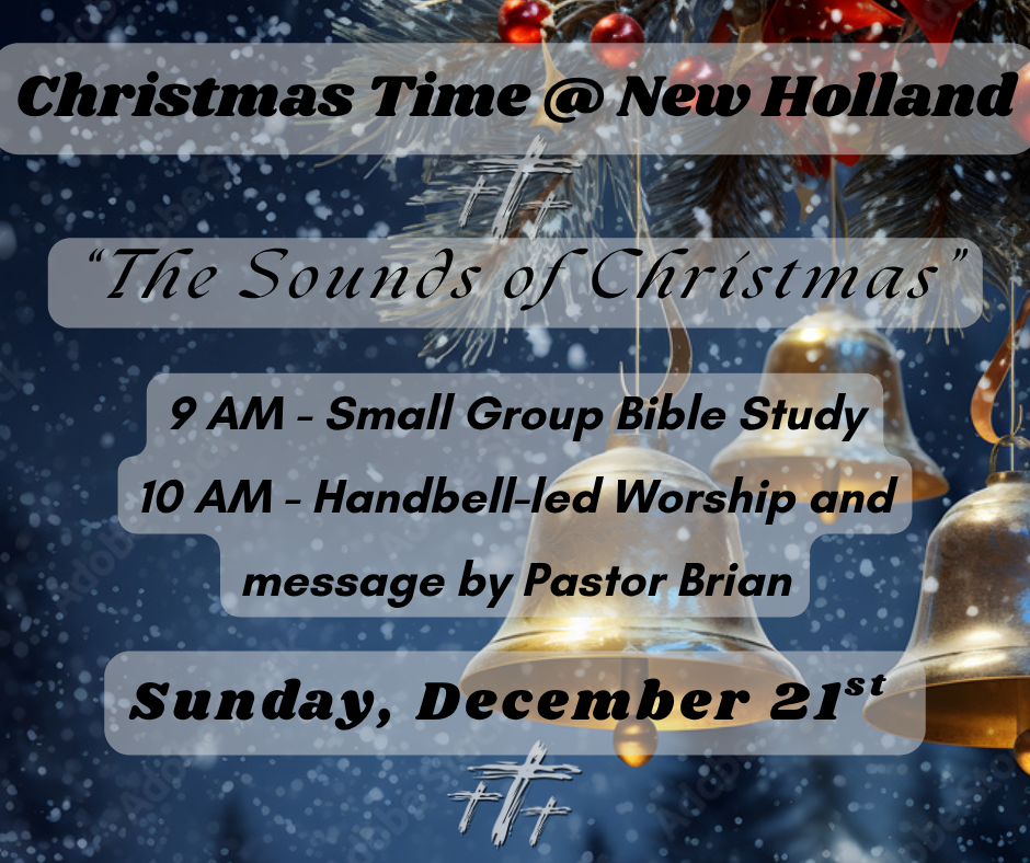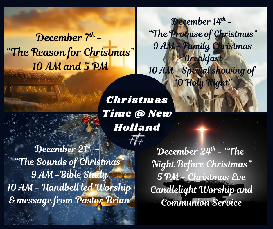 Come join us here at New Holland as we celebrate the birth of our Savior during the month of December! There are special services during the month for the whole family to be a part of and enjoy, from musical productions, a family Christmas breakfast, a special showing of "O Holy Night", handbell choir presentation, a special message given by Pastor Brian, small group Bible studies, and our Christmas Eve Candlelight and Communion Service! We hope you and your family will join us at some or all of these wonderful events! It is a blessing to be able to share with you during this Christmas season the love and hope we have in Jesus!